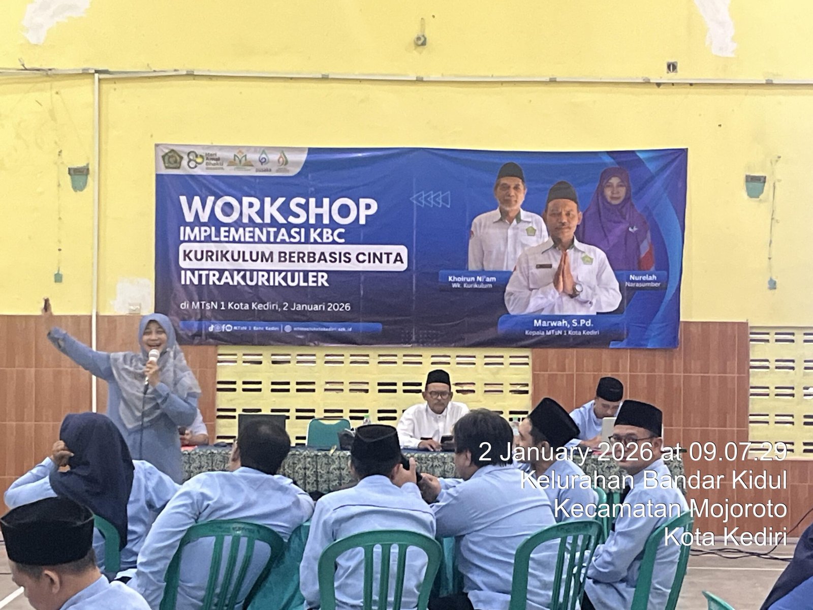 Pada Jumat, 2 Januari 2026, menyambut semester genap tahun ajaran 2025-2026, para guru dan karyawan MTsn 1 Kota Kediri mengikuti Workshop Implementasi KBC (Kurikulum Berbasis Cinta) Intrakurikuler yang dilaksanakan di Aula 1 MTsN Kota Kediri. Kegiatan ini bertujuan untuk meningkatkan pemahaman dan kompetensi pendidik dalam mengimplementasikan Kurikulum Berbasis Cinta pada proses pembelajaran intrakurikuler di sekolah.Kegiatan diikuti oleh para guru dan karyawan MTsN 1 Kota Kediri dengan bimbingan Nurelah, M. Pd. selaku narasumber. Dalam pelaksanaannya, guru diajak untuk memahami konsep dasar Kurikulum Berbasis Cinta, mendiskusikan penerapannya dalam kegiatan pembelajaran, serta merancang strategi pembelajaran yang berorientasi pada penanaman nilai-nilai Panca Cinta yaitu Cinta Allah dan Rasul-Nya, Cinta Ilmu, Cinta Lingkungan, Cinta Diri dan Sesama Manusia, serta Cinta Tanah Air. Melalui kegiatan ini, diharapkan guru dapat mengimplementasikan Kurikulum Berbasis Cinta secara efektif dalam pembelajaran intrakurikuler, sehingga tercipta lingkungan belajar yang aman, nyaman, ramah, menyenangkan, serta sejahtera bagi siswa, guru, dan seluruh warga madrasah.